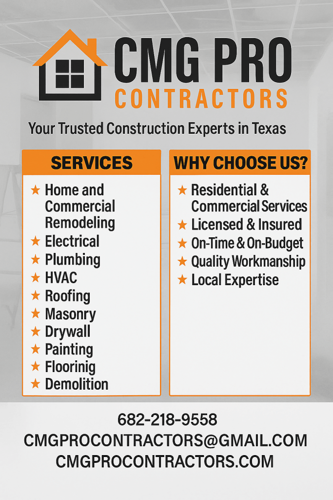 At CMG Pro Contractors, we provide a full range of residential and commercial construction services throughout the Dallas–Fort Worth area. From remodels to repairs, our team delivers dependable work, honest service, and results that last.